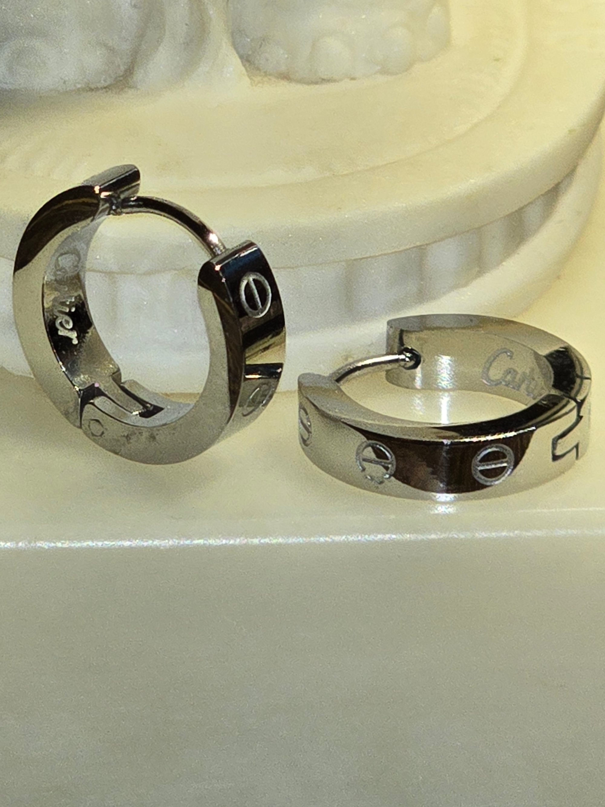 Elevate your daily jewelry stack with these timeless, designer-inspired screw motif hoop earrings. Crafted with high quality silver tone polished stainless steel. These earrings are designed to look luxurious without the high maintenance.