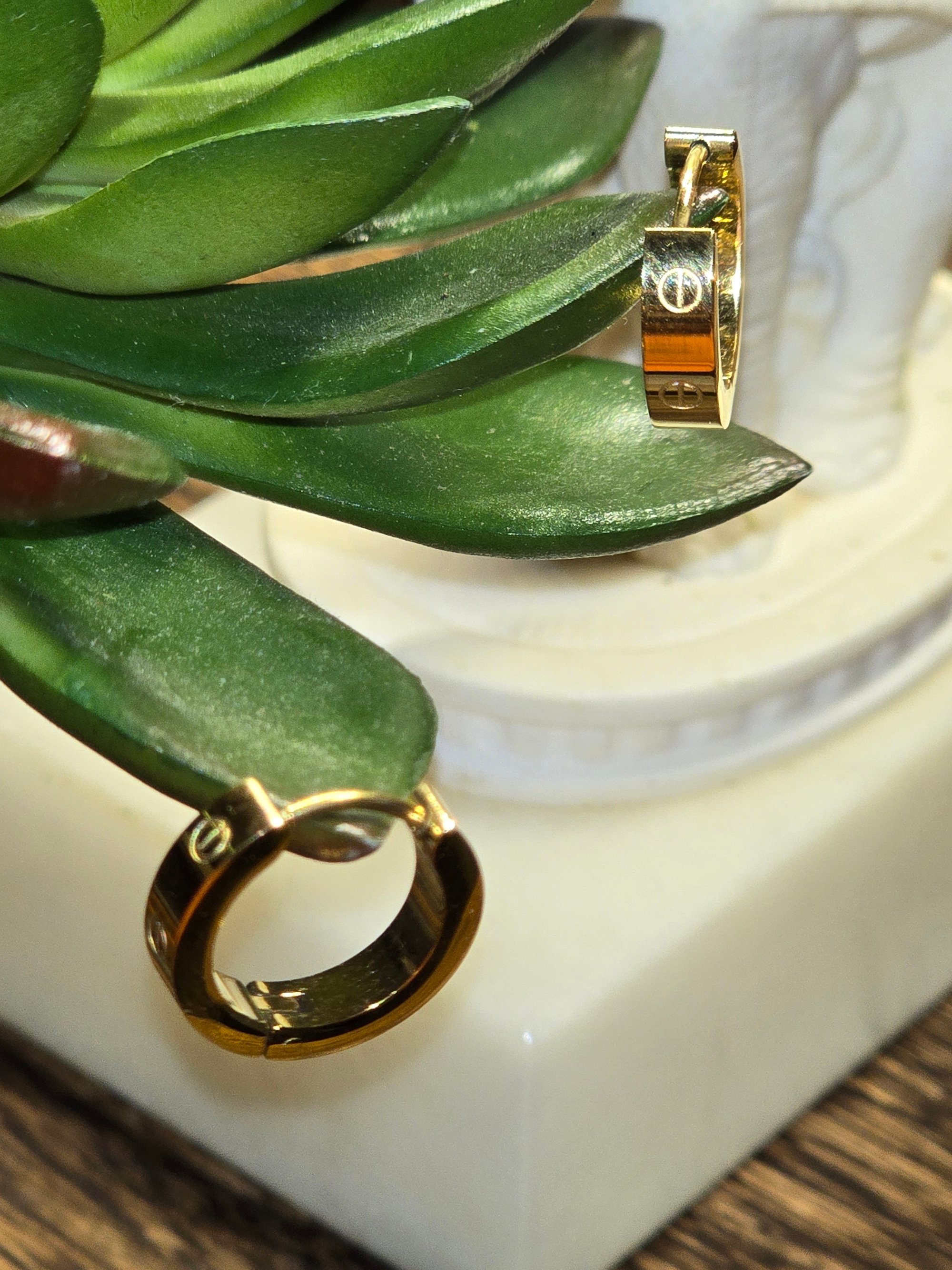 Elevate your daily jewelry stack with these timeless, designer-inspired screw motif hoop earrings. Crafted with high-quality stainless steel and a premium PVD gold coating, these earrings are designed to look luxurious without the high maintenance.