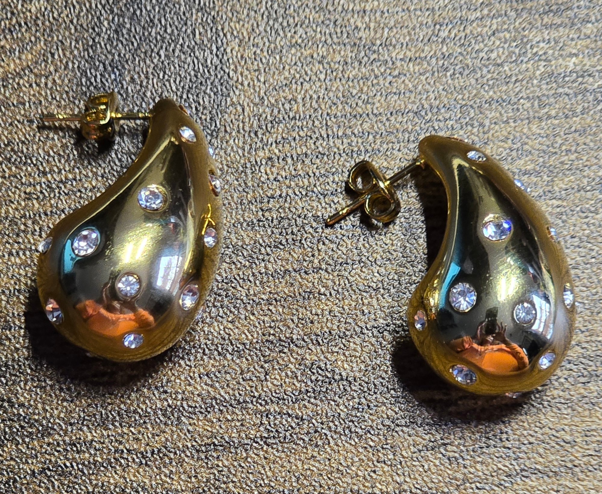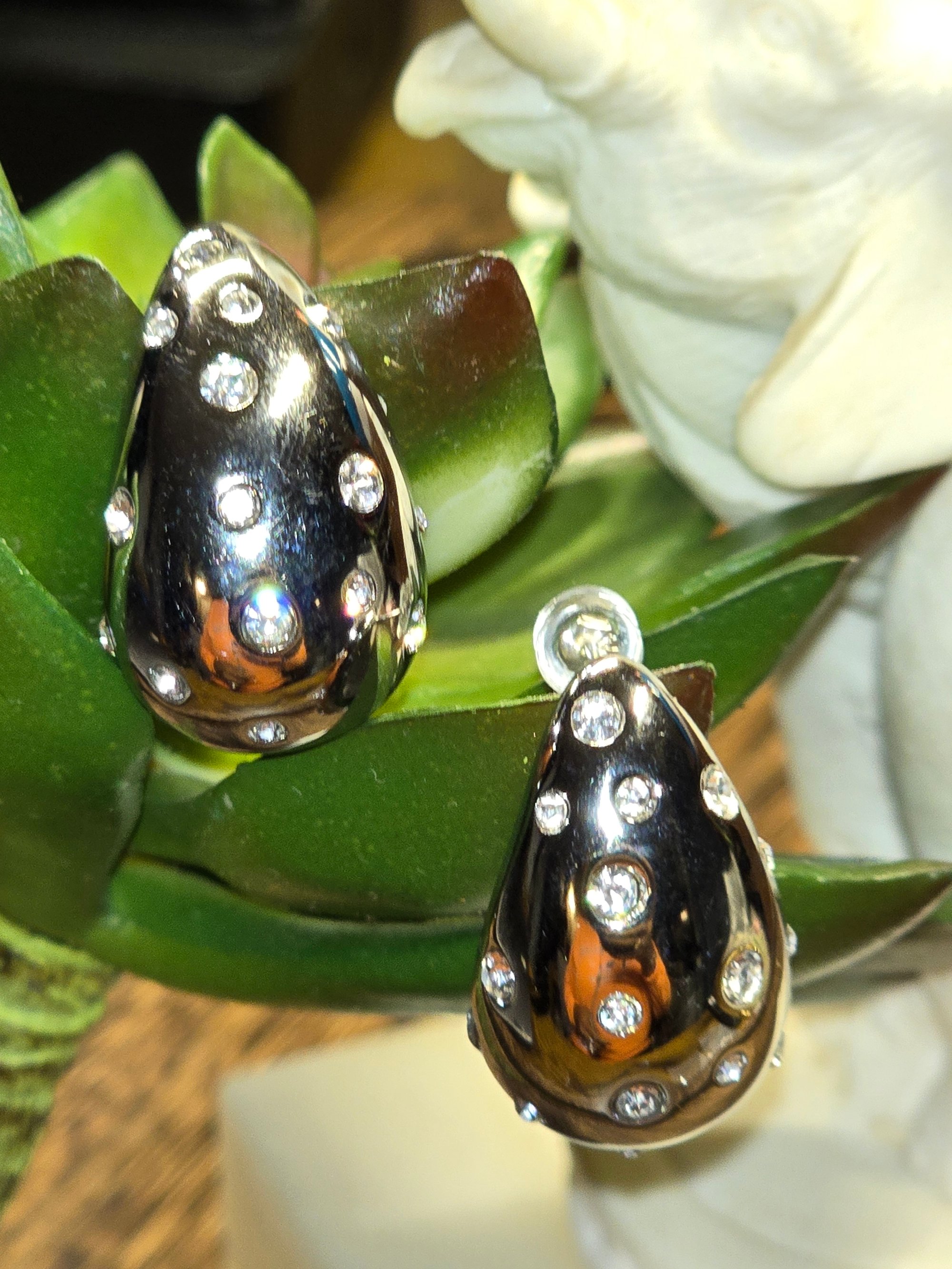 Elevate your everyday style with these stunning stainless steel teardrop earrings, designed to catch the light and attention from every angle. Crafted with a sleek, high-polish finish, each earring features shimmering diamond like clusters delicately scattered across the surface, creating a luxurious, modern look.